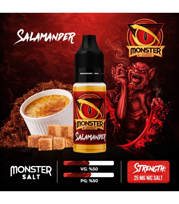 Monster Salamander Salt Likit (10ml) ile tütün, esmer şeker ve kremamsı muhallebi lezzetini keşfedin. 25mg nikotin gücü ve 50/50 PG/VG oranıyla MTL içim ve pod cihazlar için idealdir. Tatlı tütün sevenlere özel bu premium salt likit, 0.8-1.4 ohm aralığında mükemmel performans sunar. Hemen deneyin!